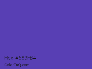 Hex #583fb4 Color is a normal indigo color and the nearest color is Plump Purple #5946b2. Hex code #583fb4 and RGB value is rgb(88,63,180). In RGB color space, this color is composed of 35% red, 25% green, 71% blue, In CMYK color space, this color is composed of 51% cyan, 65% magenta, 0% yellow , 29% black , In HSL color space, this color has a hue angle of 253° , 48% saturation and 48% lightness.