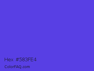 Hex #583fe4 Color is a normal indigo color and the nearest color is Majorelle Blue #6050dc. Hex code #583fe4 and RGB value is rgb(88,63,228). In RGB color space, this color is composed of 35% red, 25% green, 89% blue, In CMYK color space, this color is composed of 61% cyan, 72% magenta, 0% yellow , 11% black , In HSL color space, this color has a hue angle of 249° , 75% saturation and 57% lightness.