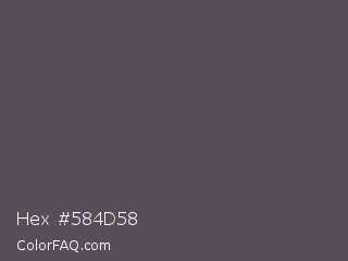 Hex #584d58 Color is a normal magenta color and the nearest color is Don Juan #5d4c51. Hex code #584d58 and RGB value is rgb(88,77,88). In RGB color space, this color is composed of 35% red, 30% green, 35% blue, In CMYK color space, this color is composed of 0% cyan, 13% magenta, 0% yellow , 65% black , In HSL color space, this color has a hue angle of 300° , 7% saturation and 32% lightness.