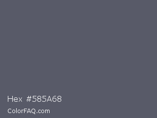 Hex #585a68 Color is a normal blue color and the nearest color is Scarpa Flow #585562. Hex code #585a68 and RGB value is rgb(88,90,104). In RGB color space, this color is composed of 35% red, 35% green, 41% blue, In CMYK color space, this color is composed of 15% cyan, 13% magenta, 0% yellow , 59% black , In HSL color space, this color has a hue angle of 233° , 8% saturation and 38% lightness.