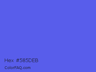 Hex #585deb Color is a light blue color and the nearest color is Majorelle Blue #6050dc. Hex code #585deb and RGB value is rgb(88,93,235). In RGB color space, this color is composed of 35% red, 36% green, 92% blue, In CMYK color space, this color is composed of 63% cyan, 60% magenta, 0% yellow , 8% black , In HSL color space, this color has a hue angle of 238° , 79% saturation and 63% lightness.