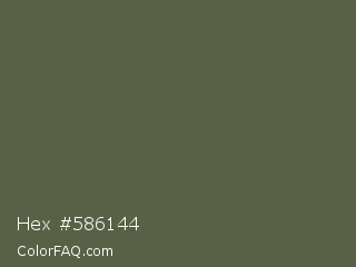 Hex #586144 Color is a normal lime color and the nearest color is Hemlock #5e5d3b. Hex code #586144 and RGB value is rgb(88,97,68). In RGB color space, this color is composed of 35% red, 38% green, 27% blue, In CMYK color space, this color is composed of 9% cyan, 0% magenta, 30% yellow , 62% black , In HSL color space, this color has a hue angle of 79° , 18% saturation and 32% lightness.