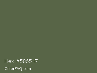Hex #586547 Color is a normal green color and the nearest color is Finch #626649. Hex code #586547 and RGB value is rgb(88,101,71). In RGB color space, this color is composed of 35% red, 40% green, 28% blue, In CMYK color space, this color is composed of 13% cyan, 0% magenta, 30% yellow , 60% black , In HSL color space, this color has a hue angle of 86° , 17% saturation and 34% lightness.