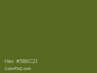 Hex #586c21 Color is a dark lime color and the nearest color is Fern Frond #657220. Hex code #586c21 and RGB value is rgb(88,108,33). In RGB color space, this color is composed of 35% red, 42% green, 13% blue, In CMYK color space, this color is composed of 19% cyan, 0% magenta, 69% yellow , 58% black , In HSL color space, this color has a hue angle of 76° , 53% saturation and 28% lightness.