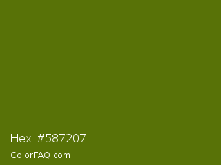 Hex #587207 Color is a dark lime color and the nearest color is Avocado #568203. Hex code #587207 and RGB value is rgb(88,114,7). In RGB color space, this color is composed of 35% red, 45% green, 3% blue, In CMYK color space, this color is composed of 23% cyan, 0% magenta, 94% yellow , 55% black , In HSL color space, this color has a hue angle of 75° , 88% saturation and 24% lightness.