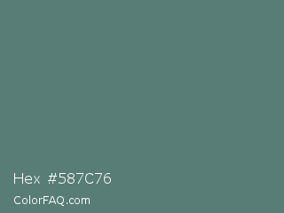 Hex #587c76 Color is a normal cyan color and the nearest color is Cutty Sark #507672. Hex code #587c76 and RGB value is rgb(88,124,118). In RGB color space, this color is composed of 35% red, 49% green, 46% blue, In CMYK color space, this color is composed of 29% cyan, 0% magenta, 5% yellow , 51% black , In HSL color space, this color has a hue angle of 170° , 17% saturation and 42% lightness.