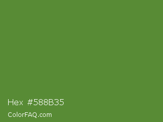 Hex #588b35 Color is a normal green color and the nearest color is Maximum Green #5e8c31. Hex code #588b35 and RGB value is rgb(88,139,53). In RGB color space, this color is composed of 35% red, 55% green, 21% blue, In CMYK color space, this color is composed of 37% cyan, 0% magenta, 62% yellow , 45% black , In HSL color space, this color has a hue angle of 96° , 45% saturation and 38% lightness.