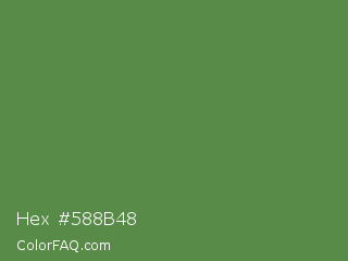 Hex #588b48 Color is a normal green color and the nearest color is Hippie Green #53824b. Hex code #588b48 and RGB value is rgb(88,139,72). In RGB color space, this color is composed of 35% red, 55% green, 28% blue, In CMYK color space, this color is composed of 37% cyan, 0% magenta, 48% yellow , 45% black , In HSL color space, this color has a hue angle of 106° , 32% saturation and 41% lightness.