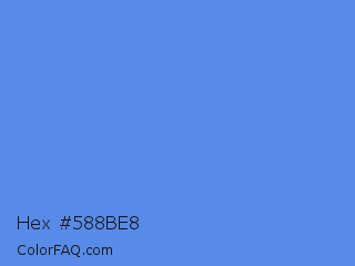 Hex #588be8 Color is a light blue color and the nearest color is United Nations Blue #5b92e5. Hex code #588be8 and RGB value is rgb(88,139,232). In RGB color space, this color is composed of 35% red, 55% green, 91% blue, In CMYK color space, this color is composed of 62% cyan, 40% magenta, 0% yellow , 9% black , In HSL color space, this color has a hue angle of 219° , 76% saturation and 63% lightness.