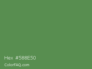 Hex #588e50 Color is a normal green color and the nearest color is Middle Green #4d8c57. Hex code #588e50 and RGB value is rgb(88,142,80). In RGB color space, this color is composed of 35% red, 56% green, 31% blue, In CMYK color space, this color is composed of 38% cyan, 0% magenta, 44% yellow , 44% black , In HSL color space, this color has a hue angle of 112° , 28% saturation and 44% lightness.