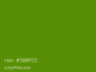 Hex #588f05 Color is a dark green color and the nearest color is Avocado #568203. Hex code #588f05 and RGB value is rgb(88,143,5). In RGB color space, this color is composed of 35% red, 56% green, 2% blue, In CMYK color space, this color is composed of 38% cyan, 0% magenta, 97% yellow , 44% black , In HSL color space, this color has a hue angle of 84° , 93% saturation and 29% lightness.