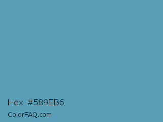 Hex #589eb6 Color is a normal blue color and the nearest color is Hippie Blue #589aaf. Hex code #589eb6 and RGB value is rgb(88,158,182). In RGB color space, this color is composed of 35% red, 62% green, 71% blue, In CMYK color space, this color is composed of 52% cyan, 13% magenta, 0% yellow , 29% black , In HSL color space, this color has a hue angle of 195° , 39% saturation and 53% lightness.