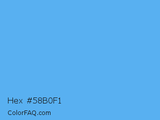Hex #58b0f1 Color is a light blue color and the nearest color is Blue Jeans #5dadec. Hex code #58b0f1 and RGB value is rgb(88,176,241). In RGB color space, this color is composed of 35% red, 69% green, 95% blue, In CMYK color space, this color is composed of 63% cyan, 27% magenta, 0% yellow , 5% black , In HSL color space, this color has a hue angle of 205° , 85% saturation and 65% lightness.