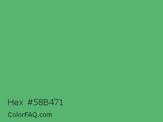 Hex #58b471 Color is a normal green color and the nearest color is Fern #63b76c. Hex code #58b471 and RGB value is rgb(88,180,113). In RGB color space, this color is composed of 35% red, 71% green, 44% blue, In CMYK color space, this color is composed of 51% cyan, 0% magenta, 37% yellow , 29% black , In HSL color space, this color has a hue angle of 136° , 38% saturation and 53% lightness.