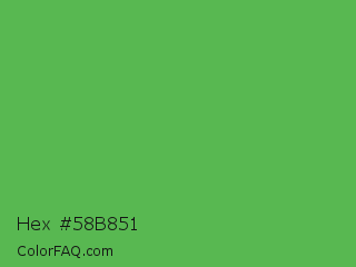 Hex #58b851 Color is a normal green color and the nearest color is Apple #4fa83d. Hex code #58b851 and RGB value is rgb(88,184,81). In RGB color space, this color is composed of 35% red, 72% green, 32% blue, In CMYK color space, this color is composed of 52% cyan, 0% magenta, 56% yellow , 28% black , In HSL color space, this color has a hue angle of 116° , 42% saturation and 52% lightness.