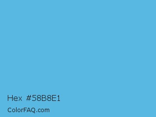 Hex #58b8e1 Color is a light blue color and the nearest color is Blue Jeans #5dadec. Hex code #58b8e1 and RGB value is rgb(88,184,225). In RGB color space, this color is composed of 35% red, 72% green, 88% blue, In CMYK color space, this color is composed of 61% cyan, 18% magenta, 0% yellow , 12% black , In HSL color space, this color has a hue angle of 198° , 70% saturation and 61% lightness.