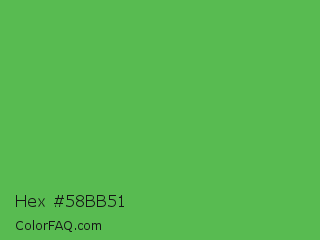 Hex #58bb51 Color is a normal green color and the nearest color is Apple #4fa83d. Hex code #58bb51 and RGB value is rgb(88,187,81). In RGB color space, this color is composed of 35% red, 73% green, 32% blue, In CMYK color space, this color is composed of 53% cyan, 0% magenta, 57% yellow , 27% black , In HSL color space, this color has a hue angle of 116° , 44% saturation and 53% lightness.