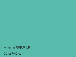 Hex #58bbab Color is a normal cyan color and the nearest color is Tradewind #5fb3ac. Hex code #58bbab and RGB value is rgb(88,187,171). In RGB color space, this color is composed of 35% red, 73% green, 67% blue, In CMYK color space, this color is composed of 53% cyan, 0% magenta, 9% yellow , 27% black , In HSL color space, this color has a hue angle of 170° , 42% saturation and 54% lightness.