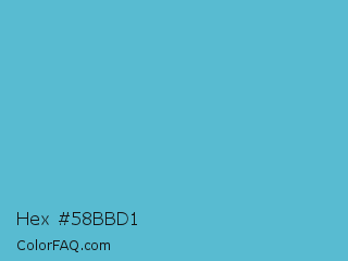 Hex #58bbd1 Color is a normal cyan color and the nearest color is Sea Serpent #4bc7cf. Hex code #58bbd1 and RGB value is rgb(88,187,209). In RGB color space, this color is composed of 35% red, 73% green, 82% blue, In CMYK color space, this color is composed of 58% cyan, 11% magenta, 0% yellow , 18% black , In HSL color space, this color has a hue angle of 191° , 57% saturation and 58% lightness.