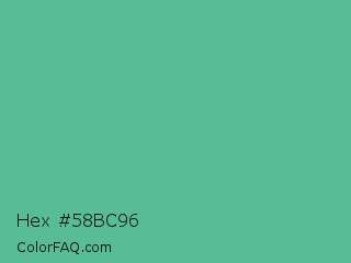 Hex #58bc96 Color is a normal green color and the nearest color is Ocean Green #48bf91. Hex code #58bc96 and RGB value is rgb(88,188,150). In RGB color space, this color is composed of 35% red, 74% green, 59% blue, In CMYK color space, this color is composed of 53% cyan, 0% magenta, 20% yellow , 26% black , In HSL color space, this color has a hue angle of 157° , 43% saturation and 54% lightness.