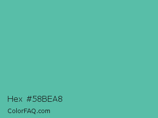 Hex #58bea8 Color is a normal cyan color and the nearest color is Tradewind #5fb3ac. Hex code #58bea8 and RGB value is rgb(88,190,168). In RGB color space, this color is composed of 35% red, 75% green, 66% blue, In CMYK color space, this color is composed of 54% cyan, 0% magenta, 12% yellow , 25% black , In HSL color space, this color has a hue angle of 167° , 44% saturation and 55% lightness.