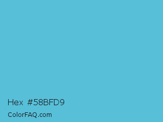 Hex #58bfd9 Color is a normal cyan color and the nearest color is Viking #64ccdb. Hex code #58bfd9 and RGB value is rgb(88,191,217). In RGB color space, this color is composed of 35% red, 75% green, 85% blue, In CMYK color space, this color is composed of 59% cyan, 12% magenta, 0% yellow , 15% black , In HSL color space, this color has a hue angle of 192° , 63% saturation and 60% lightness.