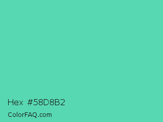 Hex #58d8b2 Color is a normal green color and the nearest color is Medium Aquamarine #66ddaa. Hex code #58d8b2 and RGB value is rgb(88,216,178). In RGB color space, this color is composed of 35% red, 85% green, 70% blue, In CMYK color space, this color is composed of 59% cyan, 0% magenta, 18% yellow , 15% black , In HSL color space, this color has a hue angle of 162° , 62% saturation and 60% lightness.