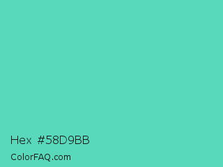 Hex #58d9bb Color is a normal cyan color and the nearest color is Medium Aquamarine #66ddaa. Hex code #58d9bb and RGB value is rgb(88,217,187). In RGB color space, this color is composed of 35% red, 85% green, 73% blue, In CMYK color space, this color is composed of 59% cyan, 0% magenta, 14% yellow , 15% black , In HSL color space, this color has a hue angle of 166° , 63% saturation and 60% lightness.