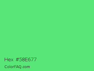 Hex #58e677 Color is a light green color and the nearest color is Very Light Malachite Green #64e986. Hex code #58e677 and RGB value is rgb(88,230,119). In RGB color space, this color is composed of 35% red, 90% green, 47% blue, In CMYK color space, this color is composed of 62% cyan, 0% magenta, 48% yellow , 10% black , In HSL color space, this color has a hue angle of 133° , 74% saturation and 62% lightness.