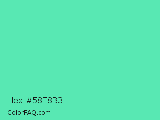 Hex #58e8b3 Color is a light green color and the nearest color is Medium Aquamarine #66ddaa. Hex code #58e8b3 and RGB value is rgb(88,232,179). In RGB color space, this color is composed of 35% red, 91% green, 70% blue, In CMYK color space, this color is composed of 62% cyan, 0% magenta, 23% yellow , 9% black , In HSL color space, this color has a hue angle of 158° , 76% saturation and 63% lightness.
