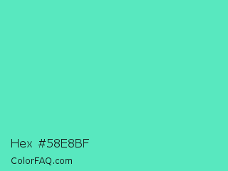 Hex #58e8bf Color is a light green color and the nearest color is Medium Aquamarine #66ddaa. Hex code #58e8bf and RGB value is rgb(88,232,191). In RGB color space, this color is composed of 35% red, 91% green, 75% blue, In CMYK color space, this color is composed of 62% cyan, 0% magenta, 18% yellow , 9% black , In HSL color space, this color has a hue angle of 163° , 76% saturation and 63% lightness.