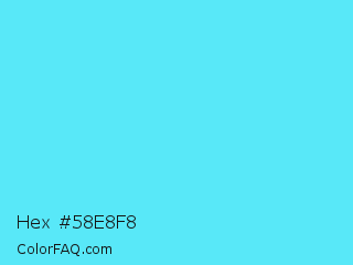 Hex #58e8f8 Color is a light cyan color and the nearest color is Turquoise Blue #6cdae7. Hex code #58e8f8 and RGB value is rgb(88,232,248). In RGB color space, this color is composed of 35% red, 91% green, 97% blue, In CMYK color space, this color is composed of 65% cyan, 6% magenta, 0% yellow , 3% black , In HSL color space, this color has a hue angle of 186° , 92% saturation and 66% lightness.
