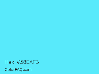Hex #58eafb Color is a light cyan color and the nearest color is Turquoise Blue #6cdae7. Hex code #58eafb and RGB value is rgb(88,234,251). In RGB color space, this color is composed of 35% red, 92% green, 98% blue, In CMYK color space, this color is composed of 65% cyan, 7% magenta, 0% yellow , 2% black , In HSL color space, this color has a hue angle of 186° , 95% saturation and 66% lightness.