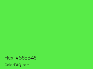 Hex #58eb48 Color is a normal green color and the nearest color is Screamin Green #66ff66. Hex code #58eb48 and RGB value is rgb(88,235,72). In RGB color space, this color is composed of 35% red, 92% green, 28% blue, In CMYK color space, this color is composed of 63% cyan, 0% magenta, 69% yellow , 8% black , In HSL color space, this color has a hue angle of 114° , 80% saturation and 60% lightness.