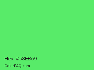 Hex #58eb69 Color is a light green color and the nearest color is Screamin Green #66ff66. Hex code #58eb69 and RGB value is rgb(88,235,105). In RGB color space, this color is composed of 35% red, 92% green, 41% blue, In CMYK color space, this color is composed of 63% cyan, 0% magenta, 55% yellow , 8% black , In HSL color space, this color has a hue angle of 127° , 79% saturation and 63% lightness.