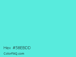 Hex #58ebdd Color is a light cyan color and the nearest color is Turquoise Blue #6cdae7. Hex code #58ebdd and RGB value is rgb(88,235,221). In RGB color space, this color is composed of 35% red, 92% green, 87% blue, In CMYK color space, this color is composed of 63% cyan, 0% magenta, 6% yellow , 8% black , In HSL color space, this color has a hue angle of 174° , 79% saturation and 63% lightness.