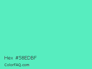 Hex #58edbf Color is a light green color and the nearest color is Medium Aquamarine #66ddaa. Hex code #58edbf and RGB value is rgb(88,237,191). In RGB color space, this color is composed of 35% red, 93% green, 75% blue, In CMYK color space, this color is composed of 63% cyan, 0% magenta, 19% yellow , 7% black , In HSL color space, this color has a hue angle of 161° , 81% saturation and 64% lightness.