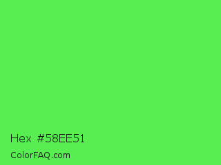 Hex #58ee51 Color is a light green color and the nearest color is Screamin Green #66ff66. Hex code #58ee51 and RGB value is rgb(88,238,81). In RGB color space, this color is composed of 35% red, 93% green, 32% blue, In CMYK color space, this color is composed of 63% cyan, 0% magenta, 66% yellow , 7% black , In HSL color space, this color has a hue angle of 117° , 82% saturation and 63% lightness.