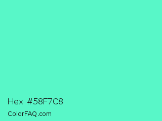 Hex #58f7c8 Color is a light green color and the nearest color is Turquoise #40e0d0. Hex code #58f7c8 and RGB value is rgb(88,247,200). In RGB color space, this color is composed of 35% red, 97% green, 78% blue, In CMYK color space, this color is composed of 64% cyan, 0% magenta, 19% yellow , 3% black , In HSL color space, this color has a hue angle of 162° , 91% saturation and 66% lightness.