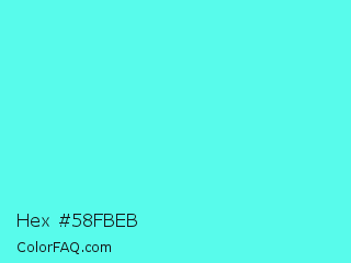 Hex #58fbeb Color is a light cyan color and the nearest color is Turquoise Blue #6cdae7. Hex code #58fbeb and RGB value is rgb(88,251,235). In RGB color space, this color is composed of 35% red, 98% green, 92% blue, In CMYK color space, this color is composed of 65% cyan, 0% magenta, 6% yellow , 2% black , In HSL color space, this color has a hue angle of 174° , 95% saturation and 66% lightness.