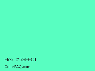 Hex #58fec1 Color is a light green color and the nearest color is Turquoise #40e0d0. Hex code #58fec1 and RGB value is rgb(88,254,193). In RGB color space, this color is composed of 35% red, 100% green, 76% blue, In CMYK color space, this color is composed of 65% cyan, 0% magenta, 24% yellow , 0% black , In HSL color space, this color has a hue angle of 158° , 99% saturation and 67% lightness.