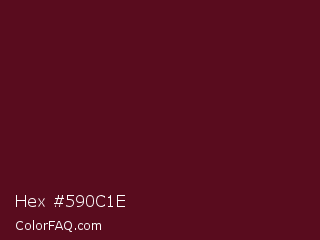 Hex #590c1e Color is a very dark red color and the nearest color is Maroon Oak #520c17. Hex code #590c1e and RGB value is rgb(89,12,30). In RGB color space, this color is composed of 35% red, 5% green, 12% blue, In CMYK color space, this color is composed of 0% cyan, 87% magenta, 66% yellow , 65% black , In HSL color space, this color has a hue angle of 346° , 76% saturation and 20% lightness.