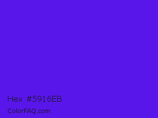 Hex #5916eb Color is a normal indigo color and the nearest color is Han Purple #5218fa. Hex code #5916eb and RGB value is rgb(89,22,235). In RGB color space, this color is composed of 35% red, 9% green, 92% blue, In CMYK color space, this color is composed of 62% cyan, 91% magenta, 0% yellow , 8% black , In HSL color space, this color has a hue angle of 259° , 84% saturation and 50% lightness.