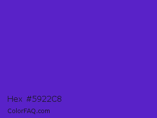 Hex #5922c8 Color is a normal indigo color and the nearest color is Purple Heart Crayola #652dc1. Hex code #5922c8 and RGB value is rgb(89,34,200). In RGB color space, this color is composed of 35% red, 13% green, 78% blue, In CMYK color space, this color is composed of 56% cyan, 83% magenta, 0% yellow , 22% black , In HSL color space, this color has a hue angle of 260° , 71% saturation and 46% lightness.
