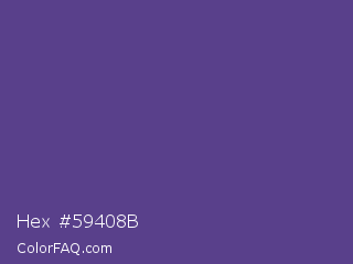 Hex #59408b Color is a normal indigo color and the nearest color is Victoria #534491. Hex code #59408b and RGB value is rgb(89,64,139). In RGB color space, this color is composed of 35% red, 25% green, 55% blue, In CMYK color space, this color is composed of 36% cyan, 54% magenta, 0% yellow , 45% black , In HSL color space, this color has a hue angle of 260° , 37% saturation and 40% lightness.