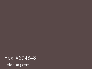 Hex #594848 Color is a normal red color and the nearest color is Emperor #514649. Hex code #594848 and RGB value is rgb(89,72,72). In RGB color space, this color is composed of 35% red, 28% green, 28% blue, In CMYK color space, this color is composed of 0% cyan, 19% magenta, 19% yellow , 65% black , In HSL color space, this color has a hue angle of 0° , 11% saturation and 32% lightness.