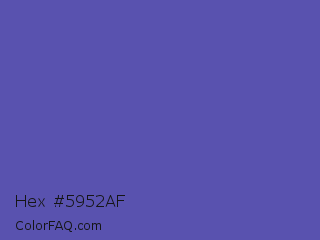 Hex #5952af Color is a normal indigo color and the nearest color is Plump Purple #5946b2. Hex code #5952af and RGB value is rgb(89,82,175). In RGB color space, this color is composed of 35% red, 32% green, 69% blue, In CMYK color space, this color is composed of 49% cyan, 53% magenta, 0% yellow , 31% black , In HSL color space, this color has a hue angle of 245° , 37% saturation and 50% lightness.