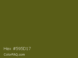 Hex #595d17 Color is a dark yellow color and the nearest color is Saratoga #555b10. Hex code #595d17 and RGB value is rgb(89,93,23). In RGB color space, this color is composed of 35% red, 36% green, 9% blue, In CMYK color space, this color is composed of 4% cyan, 0% magenta, 75% yellow , 64% black , In HSL color space, this color has a hue angle of 63° , 60% saturation and 23% lightness.