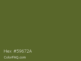 Hex #59672a Color is a dark lime color and the nearest color is Dark Olive Green #556b2f. Hex code #59672a and RGB value is rgb(89,103,42). In RGB color space, this color is composed of 35% red, 40% green, 16% blue, In CMYK color space, this color is composed of 14% cyan, 0% magenta, 59% yellow , 60% black , In HSL color space, this color has a hue angle of 74° , 42% saturation and 28% lightness.