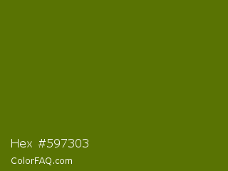 Hex #597303 Color is a dark lime color and the nearest color is Avocado #568203. Hex code #597303 and RGB value is rgb(89,115,3). In RGB color space, this color is composed of 35% red, 45% green, 1% blue, In CMYK color space, this color is composed of 23% cyan, 0% magenta, 97% yellow , 55% black , In HSL color space, this color has a hue angle of 74° , 95% saturation and 23% lightness.